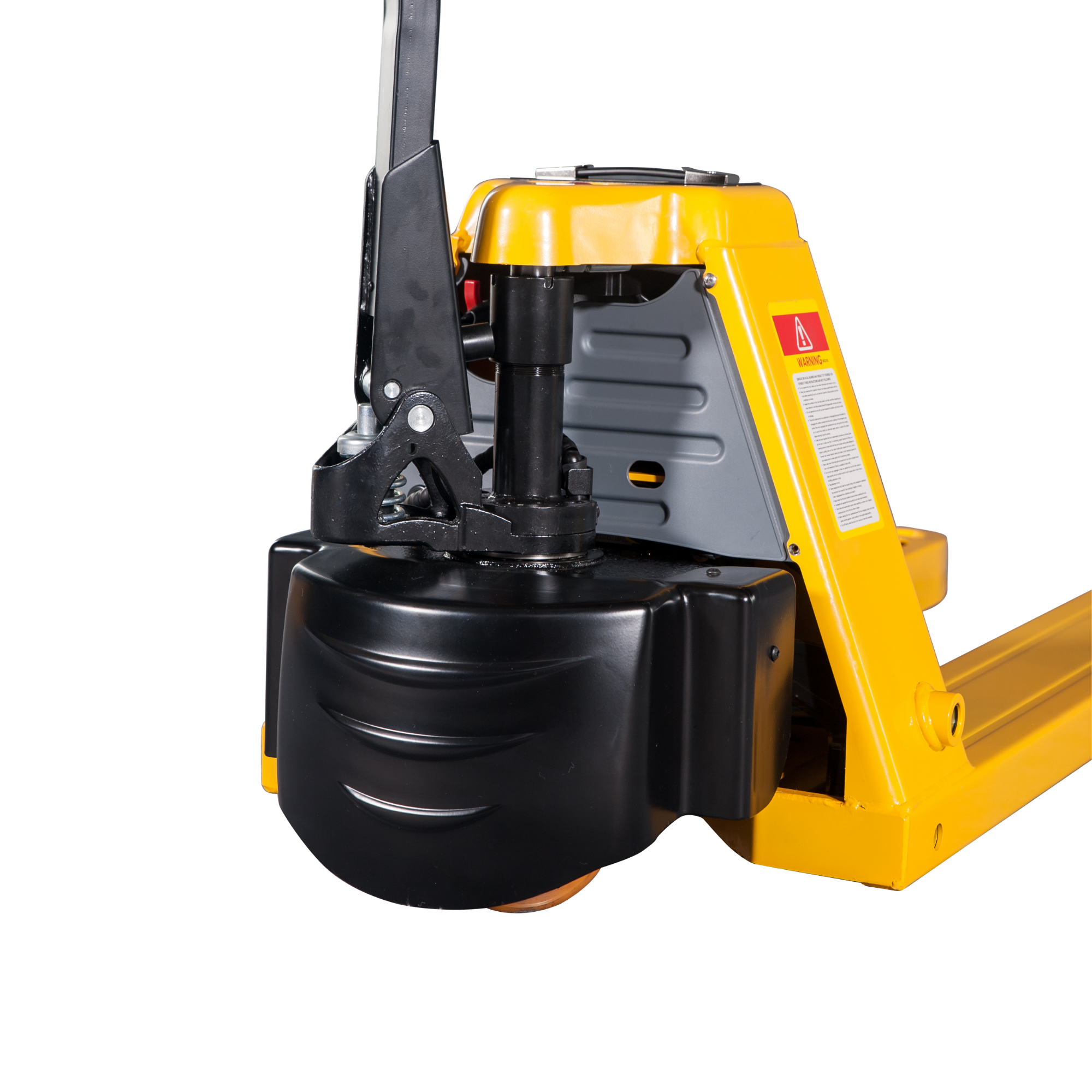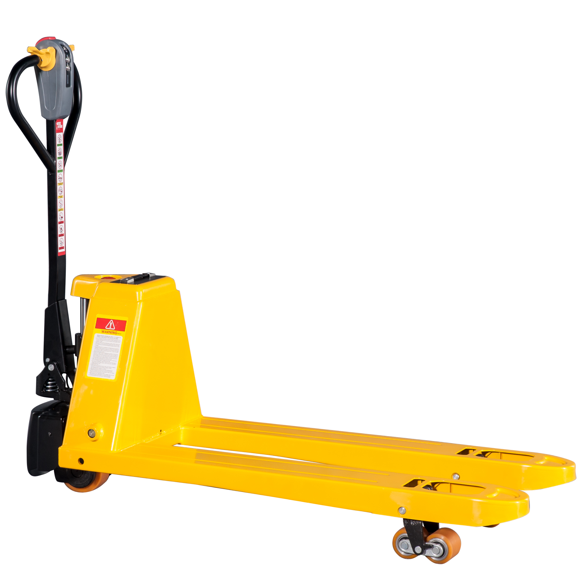 Der Elektrohubwagen verfügt über einen Multifunktionsgriff für Vorwärts/Rückwärts Fahren sowie zum Heben und Senken. Zusätzlich ist er mit einem LCD-Display, einer Hupe und einem Not-Aus-Knopf ausgestattet.