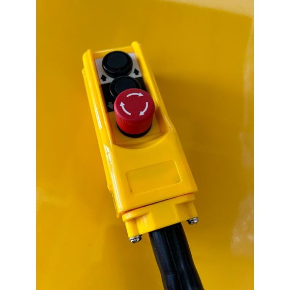 Ein separates, kabelgebundenes Bedienteil ermöglicht es Ihnen, diesen Hubtisch sicher aus der Ferne zu steuern. Das Bedienteil verfügt über Hub- und Senkschalter sowie einen Notausschalter.