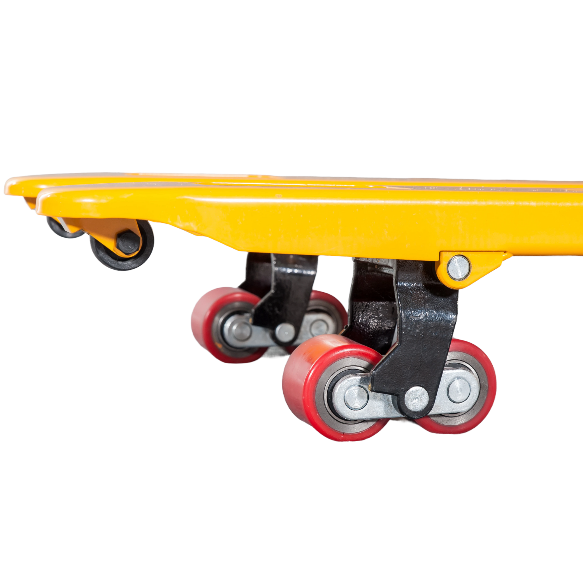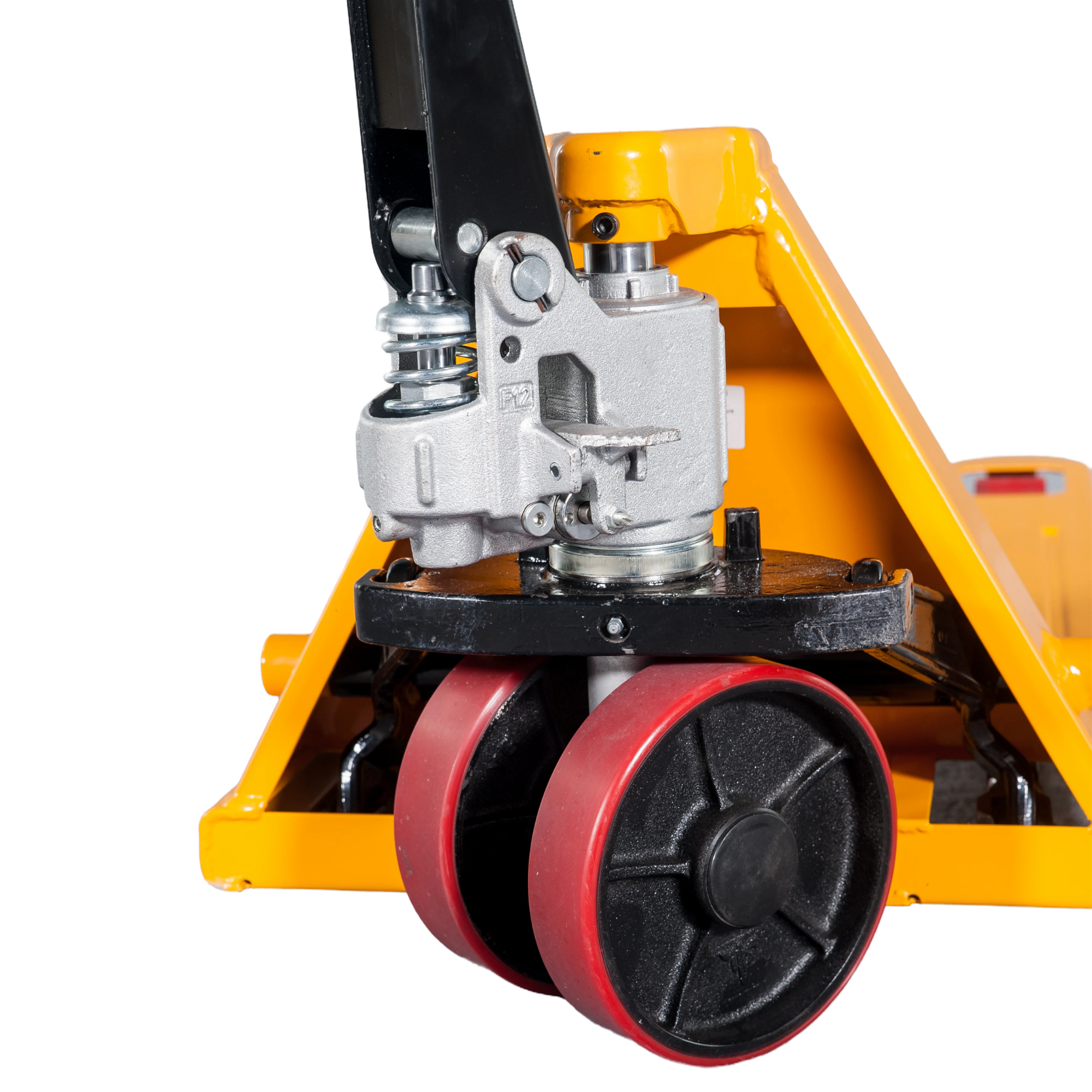 Die Tandem-Lastrollen werden mithilfe von Führungsrollen vor unerwarteten Stößen und Beschädigungen geschützt und erleichtern die seitliche Aufnahme von Paletten. Da sich die kleinen Führungsrollen auf der Unterseite der Gabelspitze befinden, ermöglichen und erleichtern sie die Bewältigung von Schwellen, die mit einem herkömmlichen Hubwagen schwer oder sogar gar nicht möglich wären.